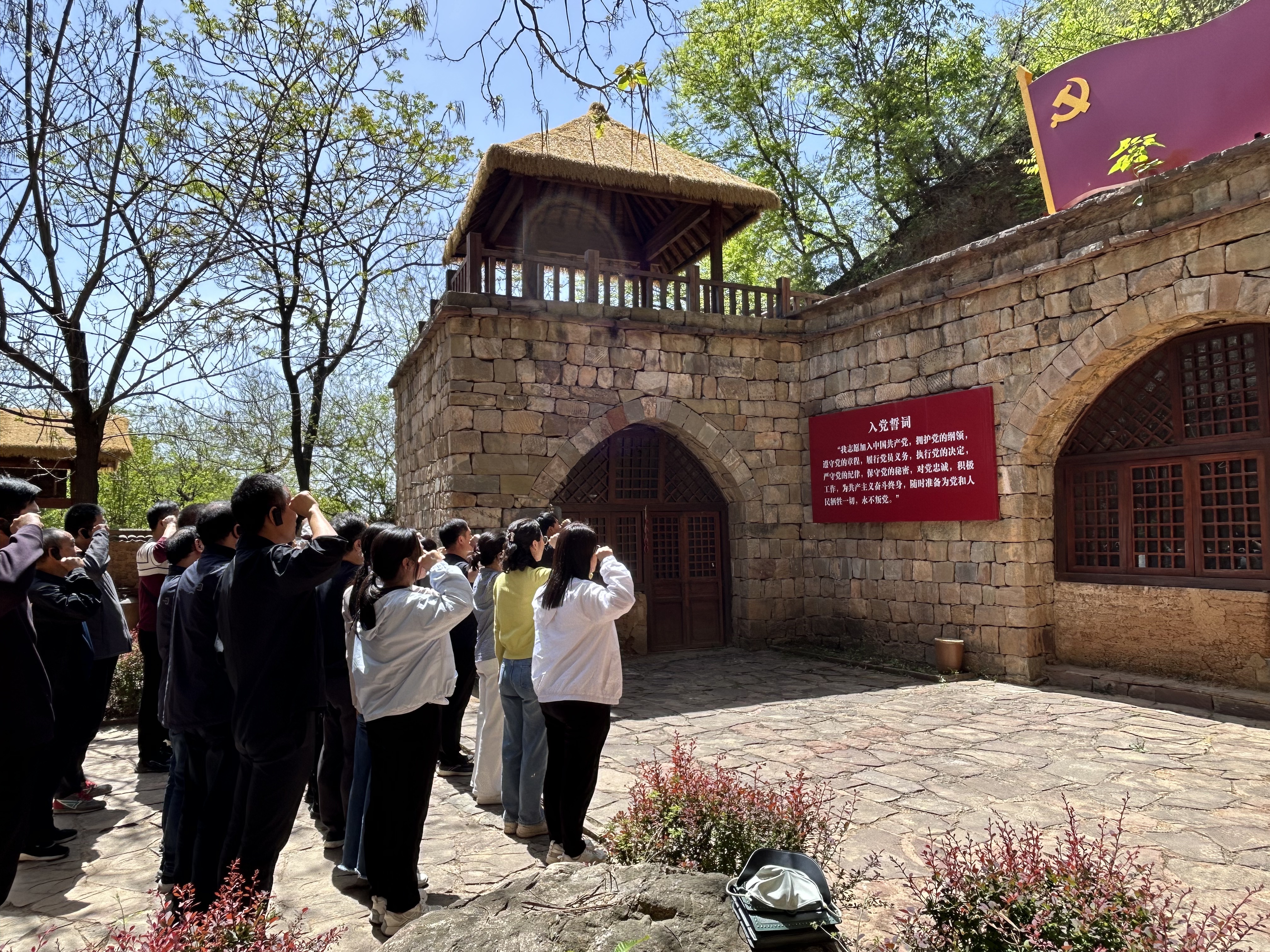 在讲解员引导下,全体人员依次参观了列子寻访小道、古代文人题词墙、愚公村遗址院落、铁卷广场、觉悟苑及搬山挑石体验区等实景教学点,一路边看边听、边思边悟,深入了解愚公移山精神的历史渊源,深刻领会“愚公移山 改造中国”的时代内涵。活动中,大家齐声诵读《列子·汤问》中《愚公移山》经典篇章,感悟其深厚文化底蕴;集中观看愚公移山皮影戏与红色主题纪录片,接受思想淬炼和精神洗礼;通过搬山挑石等体验教学,切身感受愚公移山精神蕴含的坚定信念、顽强意志与实干品格。活动最后,全体党员面向党旗重温入党誓词,以铿锵誓言砥砺初心使命。