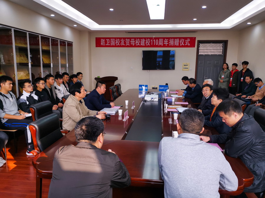 赵卫国校友在讲话中动情地讲到,今年是新中国70周年华诞,母校又迎来了110周年校庆,他用具有历史文化底蕴的学校风景画册向母校献礼,表达对母校培育的恩情和谢意。他劝诫学弟学妹要有“国家因为有你而富强,社会因为有你而进步,人民因为有你而富足”的情怀和追求,谨记好学力行、明德任责的校风校训,努力求学,发奋成才。